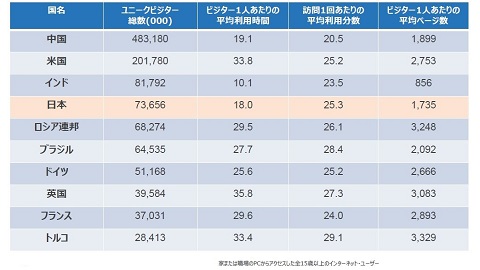 家庭または職場のPCからアクセスした15歳以上のインターネットユーザーは、7365万6000人だった。コムスコアの統計では中国の4億8318万人、米国の2億178万人、インドの8179万2000人に次いで世界で4番目。ただし日本は、1人あたりの平均利用時間が月間18.1時間で少ない傾向だという。