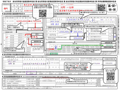 「令和7年分 給与所得者の基礎控除申告書 兼 給与所得者の配偶者控除等申告書 兼 給与所得者の特定親族特別控除申告書 兼 所得金額調整控除申告書」の記入例記入手順の詳細は、第1回記事『今年は年末調整で税金がたくさん戻って来る!?』を参照