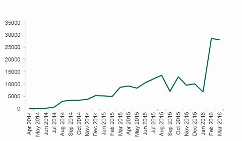 Androidランサムウェアの攻撃に遭ったユーザー数とその増加率は、PCを狙うランサムウェアと比較して少ないものの、懸念される状況に変わりありません。2014年4月の調査開始当初、Androidランサムウェアの攻撃に遭ったユーザーはほぼゼロでしたが、2016年2月の調査終盤には1か月あたり約30,000ユーザーが攻撃を受けていました。このことから、攻撃者はPCに代わる攻撃対象を積極的に探しており、Androidを狙った攻撃は今後も継続すると考えられます。