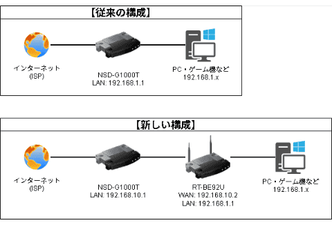 では設定に移ろう。以下、ONU内蔵ルーターの「NSD-G1000T」を既存ルーター、新規導入する「RT-BE92U」を追加ルーターと呼ぶ。