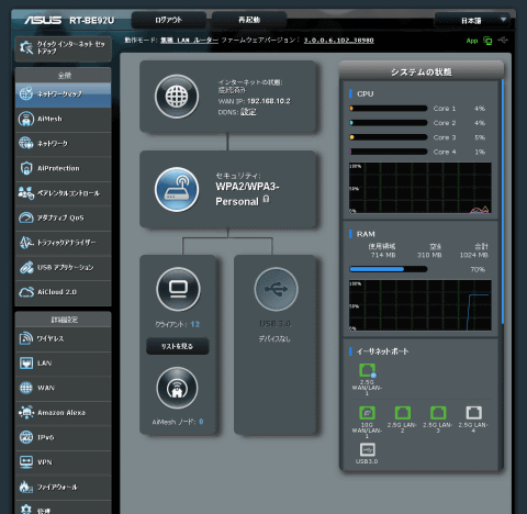 ちなみに追加ルーターとして用いた「RT-BE92U」では、メインのWi-Fiネットワークのほかに、ゲスト用などに複数のSSIDを用意できる。メインは新たに増えた6GHz帯とWi-Fi 7環境のために新たなSSIDを用意し、従来のSSIDは5GHz帯と2.4GHz帯でそのまま移行した。家庭内の通信と検証環境をある程度切り分けして使えるので、筆者としてはありがたい。