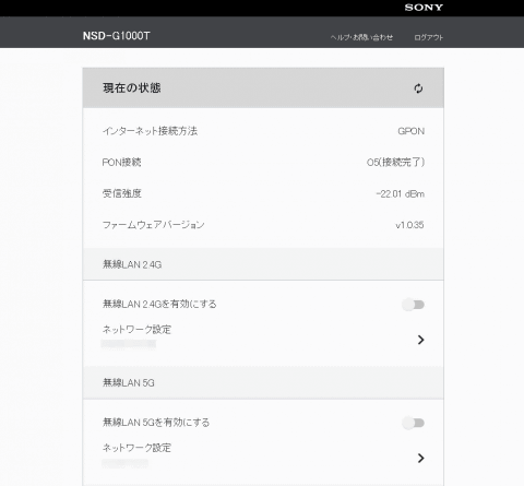NURO 光では、必ずWi-Fiルーター内蔵ONUがレンタルで提供される。筆者宅にはソニー製の「NSD-G1000T」が導入されている。Wi-Fi 6と2.5GBASE-Tに対応したもので、導入当時は有線・無線ともに最新規格が利用できる機種だった。