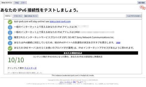 これでひととおりの手順は終わりとなるが、筆者の環境特有の問題についても話しておこう。インターネット回線は先述のとおりNURO 光のデュアルスタックとなっている。NURO 光ではデュアルスタックからIPv6ベースのMAP-Eへの移行を進めているが、筆者宅はまだ移行されていないようだ。