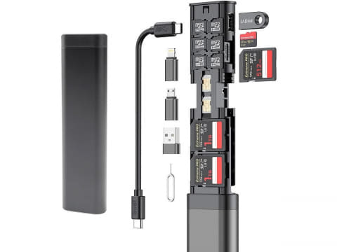 「高速リーダー機能付きアルミメモリーカードケース」は、アルミボディを採用したカード収納ケース兼リーダー。USB 3.0接続でSD/microSDカードリーダーとして利用でき、収納スペースはSDカード3枚、microSDカード15枚、nanoSIMカード2枚。セール価格は3432円。
