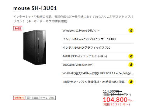 mouseブランドのデスクトップPCでは、Intel Core i3 14100に16GBメモリ、500GB SSD(NVMe Gen 4x4)を搭載した「mouse SH-I3U01」が1万円OFFの10万4800円。