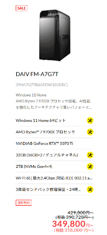 今回のセールで最も値引き額が大きいのは、「DAIV FM-A7G7T」。AMD Ryzen 7 7900XおよびNVIDIA GeForce RTX5070Tiを搭載し、32GBメモリと2TB SSD(NVMe Gen 4x4)を搭載して、8万円OFFの34万9800円となっている。