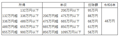 年収1095万円以下の部分の控除額は以下の表のとおり。令和6年の48万円と比べると多くの人が減税となりそうだ。