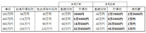 令和7年に関しては、本来は令和8年と同額になるはずだが、基礎控除・給与所得控除の改正が決まった時期が遅かったため、令和6年と同額が天引きされ、年末調整で減税分を精算することとなった。