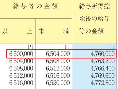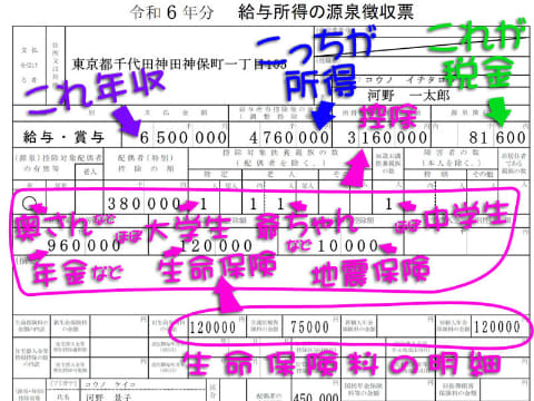 1行目の左が年収(給与の収入金額)。その右の給与所得控除は一定式で決まっていて、差し引いたのが右側の所得(給与所得)と呼ばれるもの。この年収と所得が年末調整の記入に必要となる。