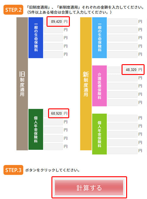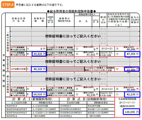 実際に使用してみた。旧制度の一般の生命保険料に8万9420円、新制度の介護医療保険料に4万8320円、旧制度の個人年金保険料に6万8920円と入力して[計算する]をクリックすると、それぞれの控除額が4万7355円、3万2080円、4万2230円となり、合計が上限の12万円を超えたので生命保険料控除額は12万円となった。保険会社のサポートツールは自動計算も楽だが、記入例も表示されるので迷わず申告書に記入できる。