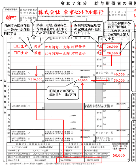 記入例では保険料の合計が10万円を超えているので、控除額は上限の5万円。計算式を見ると10万1円以上は一律に5万円となっている。この記入例は生命保険だけで12万円なので、医療保険の9万円は記入する必要はない。サラリーマン時代の筆者はこの記入例のように、10年以上、複数の保険を記入して無駄な労力を掛けていた。