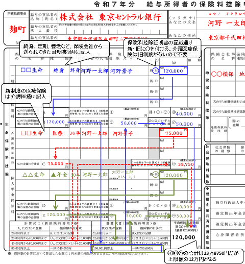 旧制度の個人年金保険料は、記入例の緑の実線矢印に沿って計算すると、控除額は5万円(ハ)。一般生命保険料、介護医療保険料、個人年金保険料の控除額の合計は13万8750円となるが、生命保険料控除の全体の上限が12万円なので合計の欄は12万円となる。