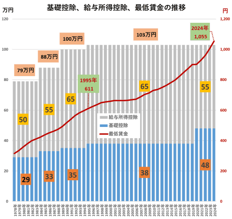 基礎控除と給与所得控除、それを合計した“年収の壁”と最低賃金をグラフにしてみた。1970年代から1990年代までは年収の壁が79万円→88万円→100万円と推移し、最低賃金と同様な伸びに見える。1995年以降30年間、年収の壁は103万円で横ばい。その間に最低賃金は611円(1995年)から1055円(2024年)まで1.73倍となった。