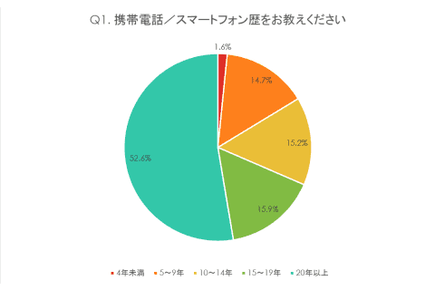 携帯電話/スマートフォン歴をたずねた質問では、「20年以上」が52.6%、「15~19年」が15.9%、「10~14年」が15.2%、「5~9年」が14.7%、「4年未満」が1.6%でした。