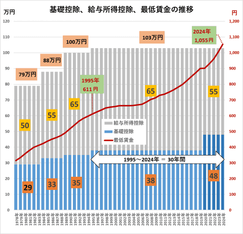 Windows 95が発売された(←関係ない)1995年に103万円となり、それから2024年まで30年間も103万円の壁は崩れることがなかった。まさに所得税のベルリンの壁(1961~1989年=28年)だ。30年間の間に、最低賃金は611円から1055円と1.73倍に上昇した。