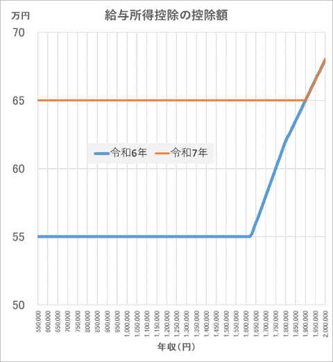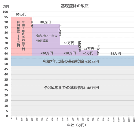 表を見ると、令和6年まで48万円だった基礎控除が、所得489万円以下(年収 約665万円以下)の人はプラス56万円で104万円となった。30年も動かなかった壁がわずか2年で激変することとなった。グラフも見ていただこう。