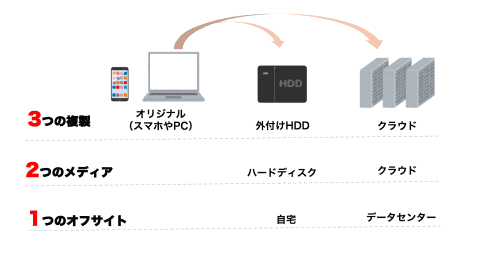 - 3つのバックアップ:データを3つ複製する