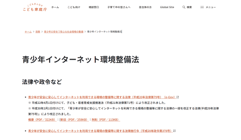日本におけるこどもの保護に関する法制度は世界でも早い方で、青少年インターネット環境整備法が2009年4月に施行されている。18歳未満への有害情報のフィルタリング機能の実装や周知に関する義務化がおもな規制内容となっている。近年の海外の事例と大きく異なる点は、利用の禁止や事業者に一方的な年齢制限による規律を課すものではないということである。基本的な視点は年齢に応じたリテラシーの向上をめざすものであり、SNS事業者ではなく携帯電話会社、アプリストアやOS事業者が用意したフィルタリング機能を、保護者とこどもが相談の上利用することを求めることが中心となっている。