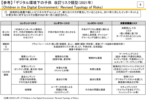 こどもを保護しつつ健全な成長を促進するためには、一定の制限が必要であるとする考えは、「デジタル環境におけるこどもに関するOECD勧告」(2012年発表、2021年改定)がベースとなっており、各国の規制でもこの勧告に基づく政策が進められている。この勧告ではリスク類型が具体的に提示されており、AI、プロフィリング等の技術的なリスクについても指摘されている。