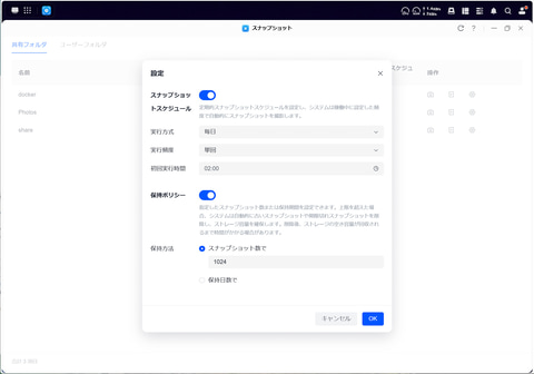 初期設定時にHDDをBtrfsを選択してフォーマットすることで、「スナップショット」アプリを使って、共有フォルダやユーザーフォルダのスナップショットを作成することが可能になった。