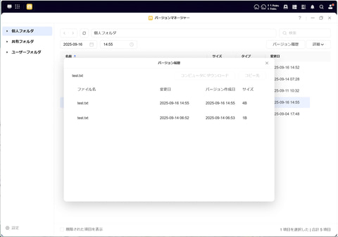 まずは「バージョンマネージャー」によるファイル単位での履歴の管理が可能だ。PC向けのアプリをインストールして同期を設定すると自動的に有効になるが、手動でSMB共有のフォルダなどでも有効化できるようになっており、ファイルが書き換えられると自動的に履歴を保存し、後から過去の履歴に復元することが可能になっている。