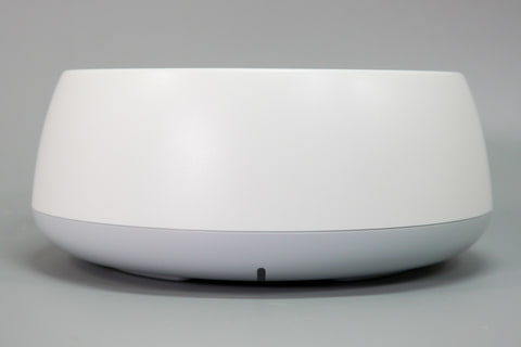 デザインは円筒形で、カラーもホワイトでシンプルな印象となっている。ロゴが中央に配置されるが本体サイズに比べて小さいので、さほど目立たない。LEDも底面側にひとつあるだけで、普段はグリーンに点灯したままなので気になることもない。もちろん、LEDコントロール機能も搭載されているので、夜間などは消灯することもできる。