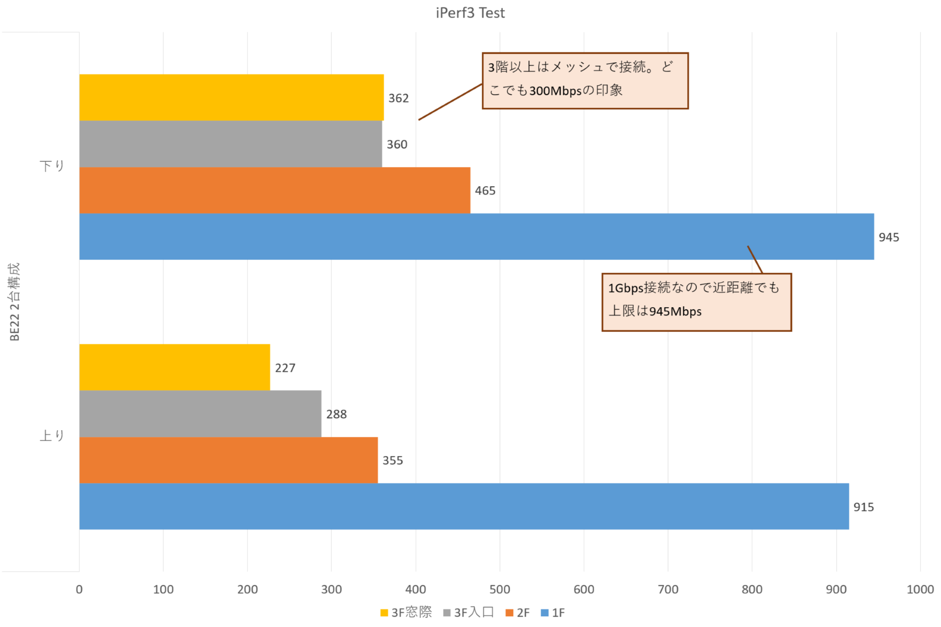 有線LANが1Gbpsなので、上限は1Gbpsまでとなるが、下りで1階が945Mbpsと1Gbpsに近い速度が出ている。2階でも465Mbps出ているので速度は問題ない印象だ。
