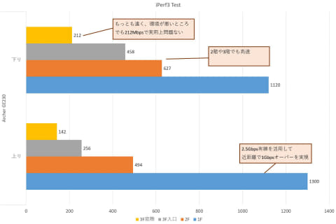 1階は、2.5Gbpsの有線のおかげで1Gbps以上の速度を実現できている。2階も下りで627Mbpsを実現できているので優秀だ。3階は、入口付近で458Mbps、最も遠い窓際で212Mbps(いずれも下り)なので、十分という印象だ。
