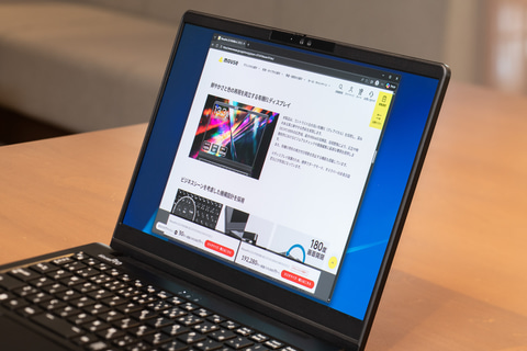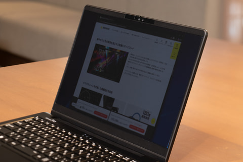 有機ELディスプレイの採用は、発色性能に優れ、視野角が広く、文字もくっきり見えるという点は大きな利点だが、ビジネス用途では気になる点もある。それは、覗き見された場合でも内容がはっきり見えてしまうという点だ。実際に、C3-I7U01BK-Aのディスプレイをやや斜めから見た場合でも、表示されている内容がくっきり見える。特にC3-I7U01BK-Aは、モバイル用途もターゲットとした小型軽量ボディが特徴で、屋外での利用も想定していることもあって、特に覗き見対策は重要となる。