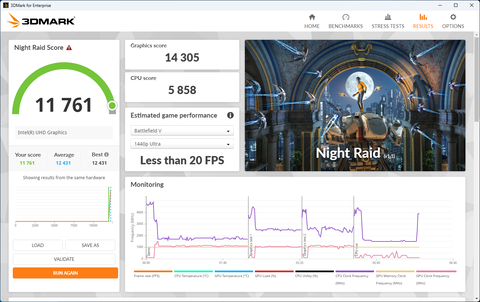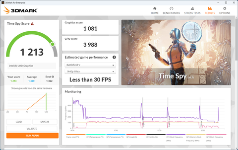 続いて3D描画能力を評価する3DMarkの結果だ。こちらはNight Raid、Fire Strike、Time Spyと3種類のテストを行ったが、こちらもプロセッサー内蔵グラフィックスとして申し分ないスコアとなっている。ビジネスPCなのでゲームをプレイすることはないと思うが、ビジネスシーンで利用するアプリの多くが3Dグラフィックスのアクセラレーション機能を活用しており、実は見えないところで使われている。つまり、3D描画能力が申し分ないことでビジネスアプリ利用時の快適度を高めてくれるため、この点でも安心だ。