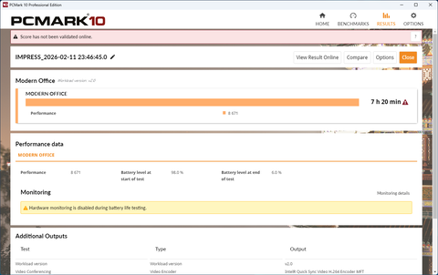 そして、モバイル用途もターゲットとしていることから、バッテリー駆動時間も検証してみた。C3-I7U01BK-Aでは、アイドル状態で約10時間のバッテリー駆動が可能とされているが、ディスプレイ輝度を50%に設定し、PCMark 10のBatteryテスト「PCMark 10 Battery Profile」の「Modern Office」(日常業務を想定したシナリオ)で計測したところ、7時間20分を記録。これだけの駆動時間があれば、外出時も安心して利用できるだろう。