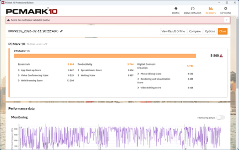 まずPCの総合的なパフォーマンスを評価するPCMark 10の結果は5860と、ミドルレンジのノートPCに匹敵するスコアが得られている。このスコアなら、Office系アプリを中心としたビジネスアプリの利用で動作の重さを感じる場面はほぼないと言える。