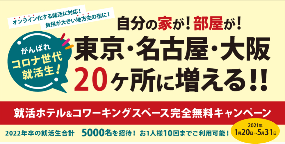 就活生に無料でホテル・ワーキングスペースを開放、東京・名古屋・大阪の計20施設で