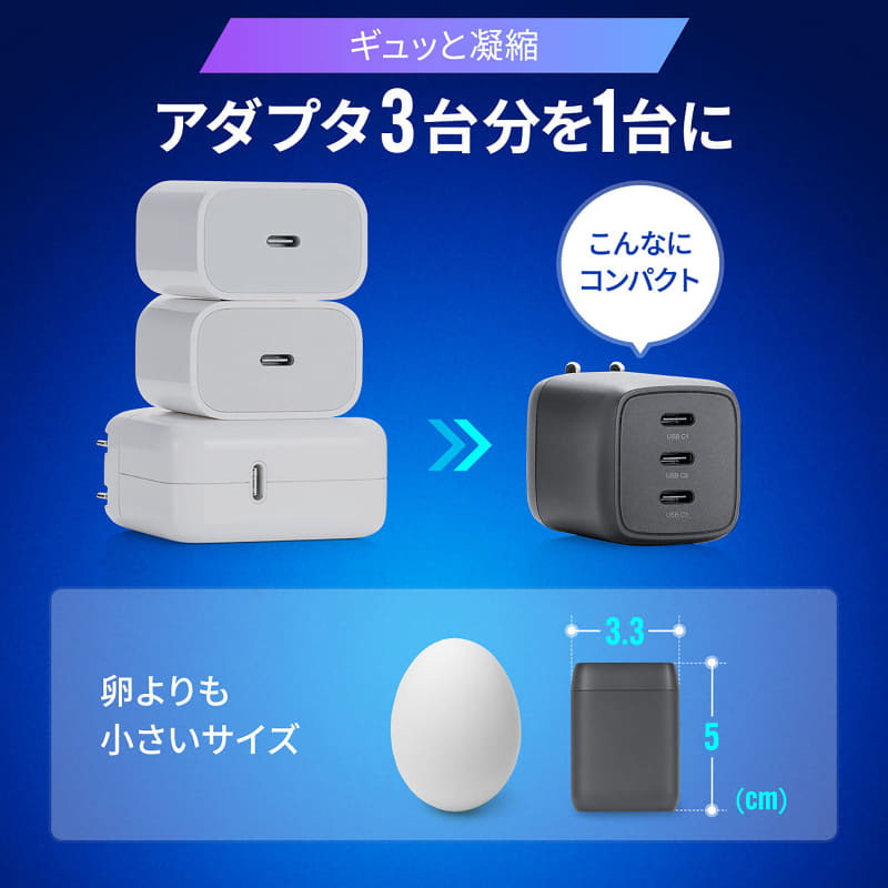 小型でもUSB Type-C×3ポート、最大67W出力の充電器、サンワサプライが発売(5/6)