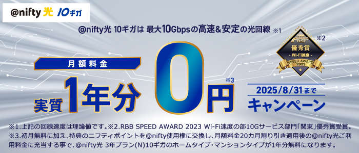 ニフティ、「@nifty光 3年プラン(N)10ギガ」新規申込者を対象に「月額料金1年分実質最大0円キャンペーン」を実施