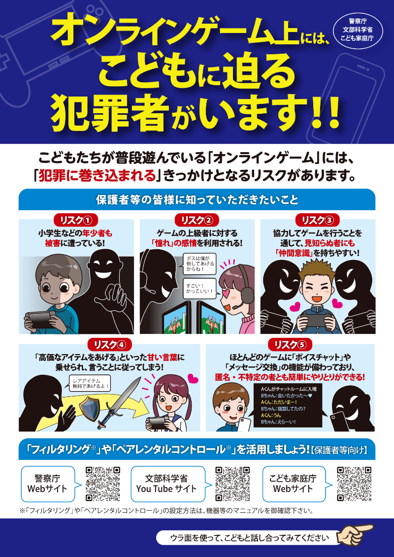 警察庁、保護者向けに「ゲーム上で子どもの信頼を得たうえで犯罪行為を行う者がいる」とオンラインゲームの現状を説明し、注意喚起
