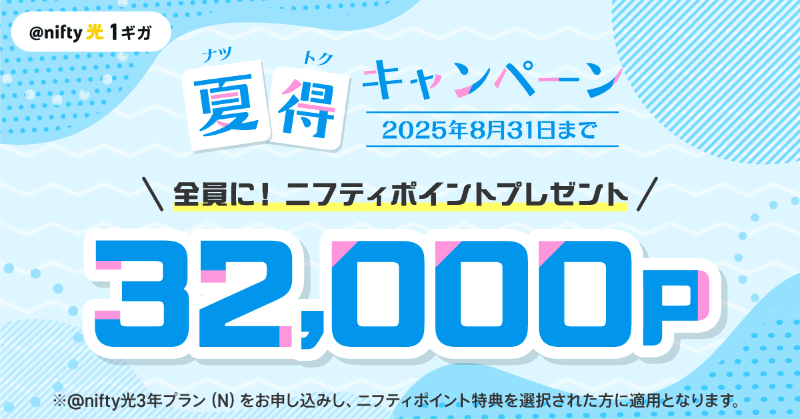 「@nifty光 3年プラン(N)10ギガ」新規申込で最大1年分の月額料金分のポイントをプレゼント、8月31日まで