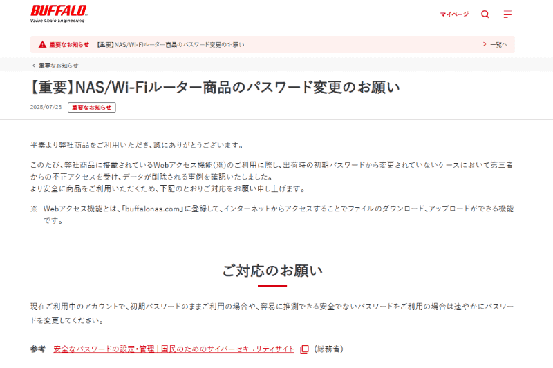 バッファロー、NASおよびWi-Fiルーターのパスワード変更を呼び掛け、不正アクセスの事例受け