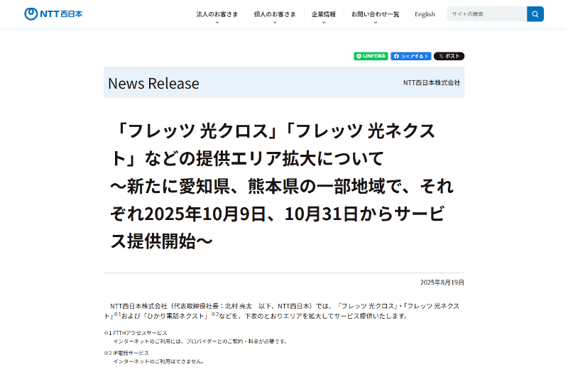NTT西日本、2025年度の「フレッツ 光クロス」提供エリア拡大予定を発表。北陸・沖縄にも提供開始
