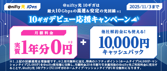 ニフティが「@nifty光 10ギガ」提供開始、最大10Gbpsの光回線サービス