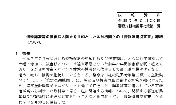 警察庁、銀行10行と「情報連携協定書」締結。特殊詐欺やSNS型投資・ロマンス詐欺の被害拡大を受け