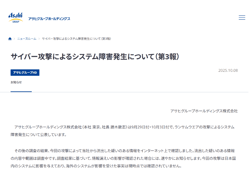 アサヒグループHD、システム障害はランサムウェア攻撃によるものと続報発表