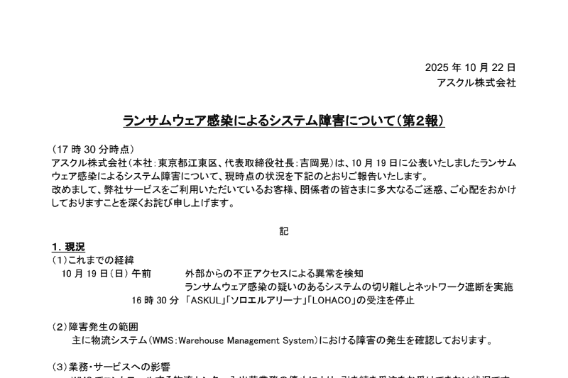 アスクル、ランサムウェアによるシステム障害でサービス停止