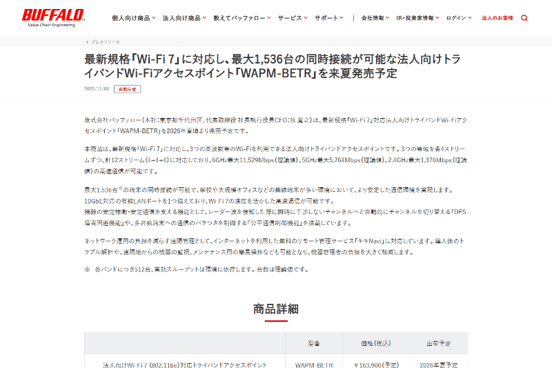 バッファロー、新たに法人向けWi-Fiアクセスポイント10型番でJC-STAR「★1」取得