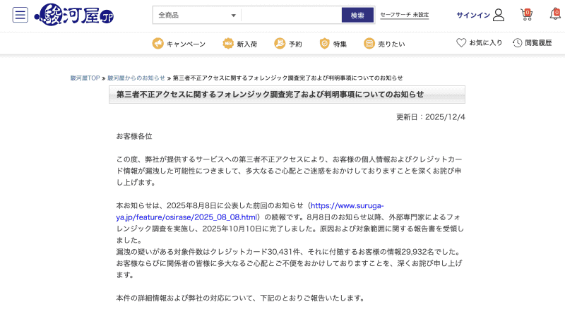 「駿河屋.JP」が改ざんされ、クレジットカード情報を含む個人情報が漏えい