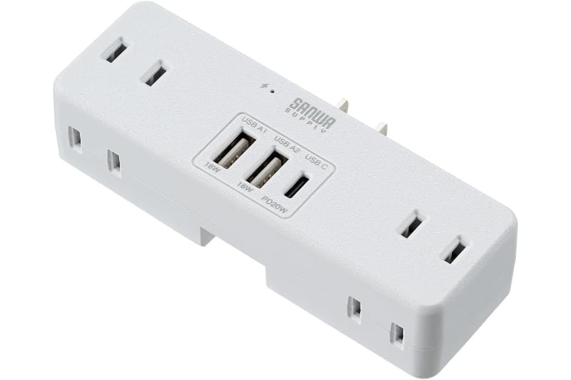 「車輪差し」構造で、縦と横に加えて各ポート間にも自在に差し込める電源タップ、サンワサプライが発売