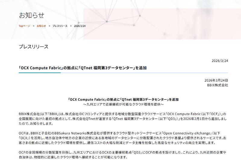 IDCフロンティアとBBIX、各地のデータセンターにクラウド基盤を分散配置する「OCX Compute Fabric(OCF)」を提供